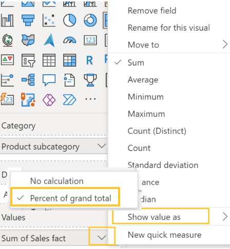 В строке значений, там, где сейчас располагается поле Продажи факт, вы видите приставку “Sum of”. Это тип агрегации, который Power BI автоматически выставляет числовым значениям, но мы можем с ним работать. Для этого необходимо нажать на стрелку как показано на рисунке 5–7. В выпадающем списке вы увидите все возможные варианты. Чтобы решить нашу задачу, нам нужно выбрать Показать значение как (Show value as), а затем Процент от общей суммы (Percent of grand total). Теперь значения будут отображаться в процентах от общей суммы. Запомните эту опцию, она пригодится вам в будущем.