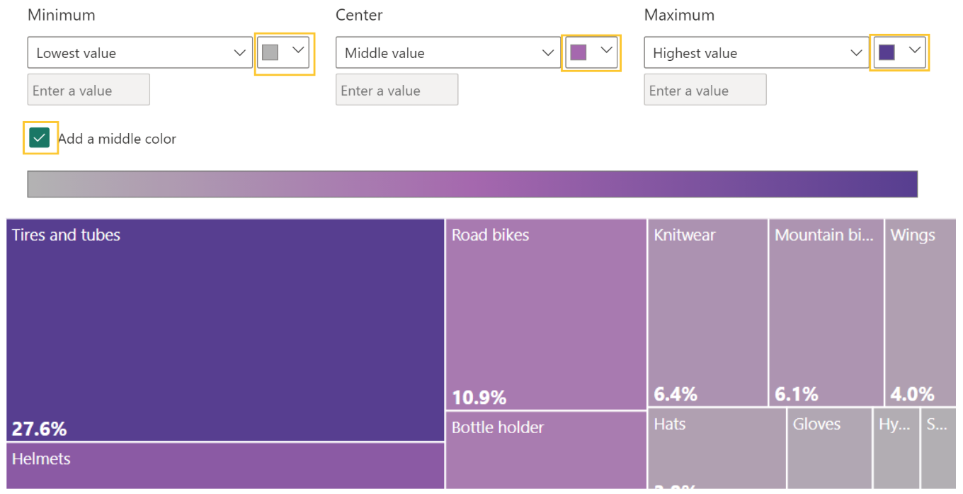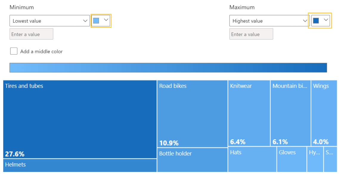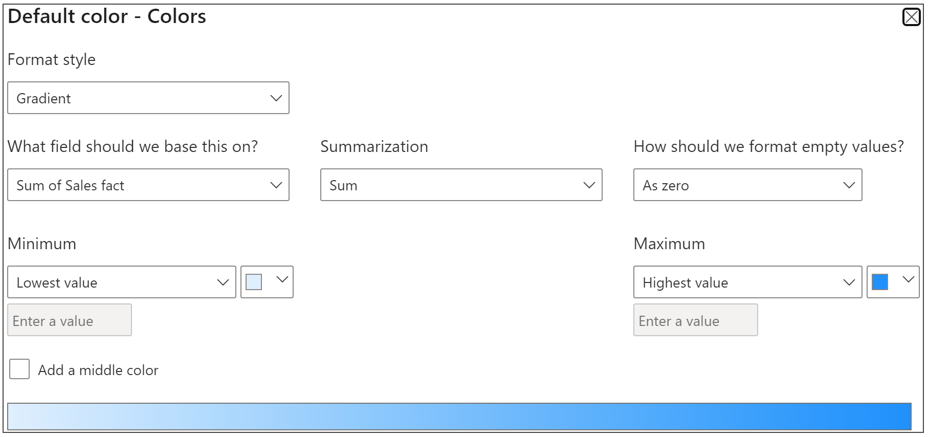 * Минимум – самый светлый цвет. Можно оставить автоматическое определение минимального значения из набора данных или выставить значение вручную. Цвет задан по умолчанию примененной темой, но мы можем его изменить.