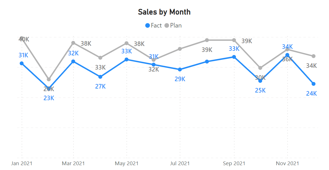На дашбордах обычно смотрим данные по месяцам, сравниваем плановые показатели с фактическими и наблюдаем определенные тенденции. График по дням часто похож на электрокардиограмму, что затрудняет выявление тенденций. С другой стороны, квартальные графики слишком сильно сглаживают тенденции. Встречаются задачи, когда мы с помощью фильтров задаем графикам такие временные диапазоны, чтобы нужный уровень иерархии выглядел информативно, но в качестве примера мы возьмем наиболее распространенный вариант и пошагово построим линейный график по месяцам.