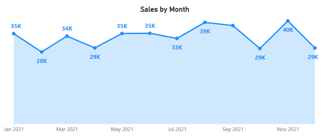 Может оказаться, что у нас нет плановых значений, и мы оцениваем только динамику факта. В этом случае, чтобы диаграмма из одной только линии не выглядела пустой, можно добавить полупрозрачную заливка области под линией (рисунок 6–2). Технически это уже другой визуал в Power BI – Диаграмма с областями (Area chart), но работает она точно таким же образом, что и линейный график.