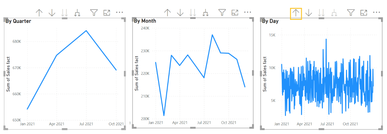 Последовательно разворачивая иерархию мы получим графики продаж по кварталам, месяцам и дням (рисунок 6–4). Если нужно вернуться на уровень выше, нажимаем стрелку вверх.