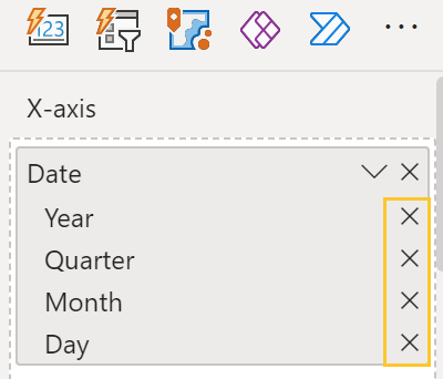 Давайте развернем поле Дата на панели данных. Внутри него лежит группа Иерархия дат, а уже дальше – год, квартал, месяц, день. По умолчанию Power BI отображает иерархию с верхнего уровня, то есть с года. Поэтому мы и получили на графике одну точку. Рабочие кнопки стрелок над диаграммой выполняют работу по переключению между уровнями иерархии. На рисунке 6–3 выделена “раздваивающаяся” стрелка Развернуть все вниз на один уровень в иерархии. Она корректным образом переведет нас до квартала, месяца или дня.