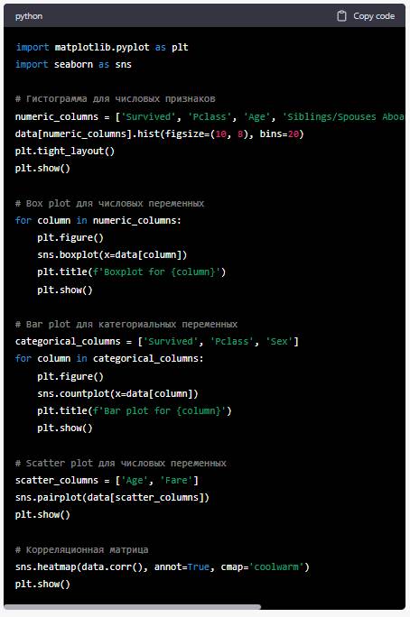Этот код создаст графики визуализации, включая гистограммы, box plot, bar plot, scatter plot и корреляционную матрицу для различных столбцов данных. Гистограммы и box plot используются для числовых переменных, в то время как bar plot используется для категориальных переменных. Scatter plot и корреляционная матрица позволяют наблюдать взаимосвязь между числовыми переменными.