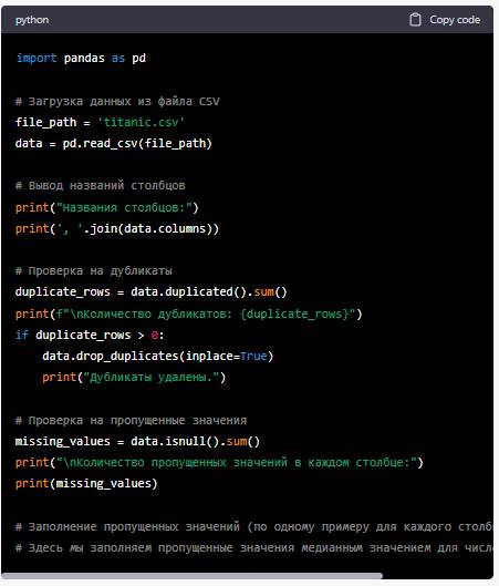 Конкретизировать наши запросы, напоминая ChatGPT о том, что библиотека pandas уже установлена, и что файл titanic.csv уже загружен в переменную data.