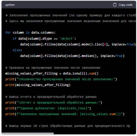 После выполнения этого кода вы получите отчет о предварительной обработке данных, включая количество удаленных дубликатов и заполненных пропущенных значений. Код также выводит первые 10 строк обработанных данных для предварительного просмотра.