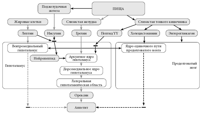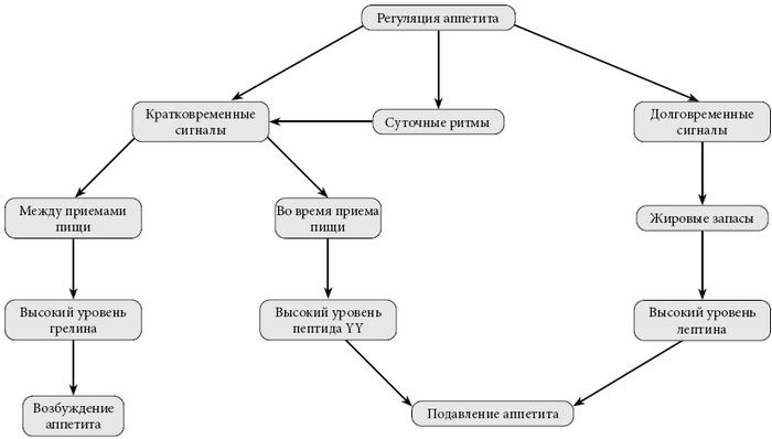 В кишечнике вырабатывается целый ряд гормонов, регулирующих аппетит и пищеварение. Пептид YY, который образуется в толстом кишечнике, замедляет продвижение пищи по желудочно-кишечному тракту и подавляет аппетит.