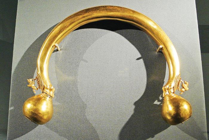 В районе Шатийон-сюр-Сен, недалеко от кельтского оппидума (укрепления) Латиск, находится курган, где ученые обнаружили захоронение знатной княгини – Леди из Викса. Тело княгини было уложено на колесницу, украшено золотыми браслетами и янтарными ожерельями. Вместо тиары ее голову венчал золотой торквес (гривна) (рис. 2) – характерное шейное украшение, встречавшееся у многих народов, включая персов и скифов. Гривна из Викса демонстрирует стиль ранних кельтских изделий – на концах она стилизована под львиные лапы и украшена крылатыми лошадьми.