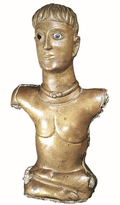 Статуя оленерогого бога Цернунна (рис. 9) начала I века до н. э. показывает, как развивалась кельтская пластика в поздний латен. Все та же поза лотоса, что у вождей, но линии исполнения гораздо более плавные, глаза сделаны из белого и синего стекла. Шею статуи украшает уже знакомый нам торквес, а ноги заканчиваются копытами, отчего ее ассоциируют с божеством (не исключая, правда, что это очередное изображение героического предка).