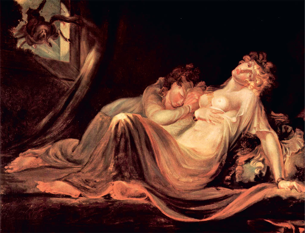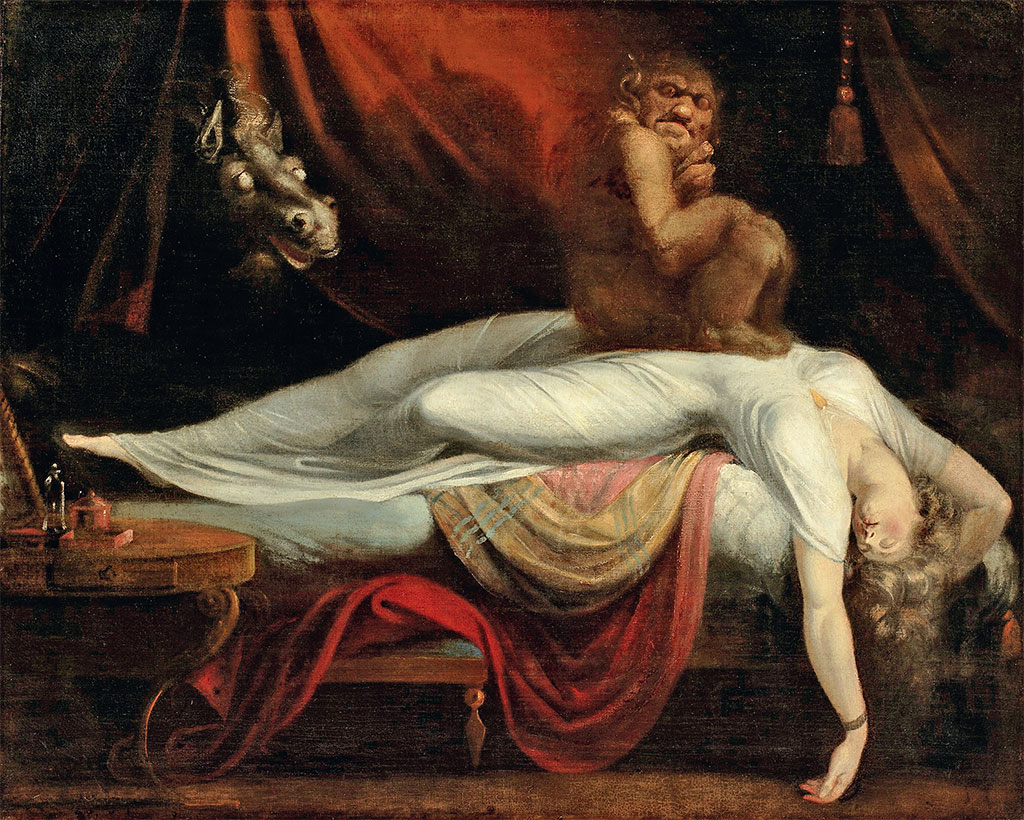Через два года после возвращения в Лондон Фюссли создает свое самое известное произведение – «Ночной кошмар». Фюссли показал картину на ежегодной выставке лондонской Королевской академии в 1782 году и произвел настоящий фурор. В «Кошмаре» нет назидательного сюжета, нет обращения к истории, религии или мифологического сюжета. Это фантазия, но такая, что подсознательно знакома каждому человеку. Женщина спит в беспокойной, даже страдающей позе. Исследователи настойчиво ассоциируют облик героини с Анной Ландольт, из-за которой Фюссли покинул Италию. На ее груди сидит демон-инкуб и задумчиво смотрит в пустоту. Из-под тяжелого полога высовывается лошадиная голова. Ее глаза слепы, а вьющаяся грива стоит дыбом. В этом образе есть кошмар, исследование природы сна, а также затаенный эротизм – недаром копия картины висела в квартире у Зигмунда Фрейда. Лошадь иногда трактуется как символ богини Гекаты, хозяйки инкуба. В актуальном для эпохи Фюссли словаре лошадь – это образ злого духа мара, который как раз таки и есть то существо, которое садится на грудь спящего (в России за сонный паралич отвечает домовой). Но место занято демоном-инкубом. Инкуб может вступать со спящей женщиной в интимную связь. Этот эротический подтекст не только читается в символике картины, но и косвенно подтверждается творчеством Фюссли, создателя множества эротических и даже порнографических рисунков, большую часть которых после смерти художника уничтожила его супруга София. Таким образом, «Ночной кошмар» оказал влияние не только на жанр хоррора (картиной вдохновлялись Эдгар По и Говард Лавкрафт), но и на грядущую индустрию психоанализа.