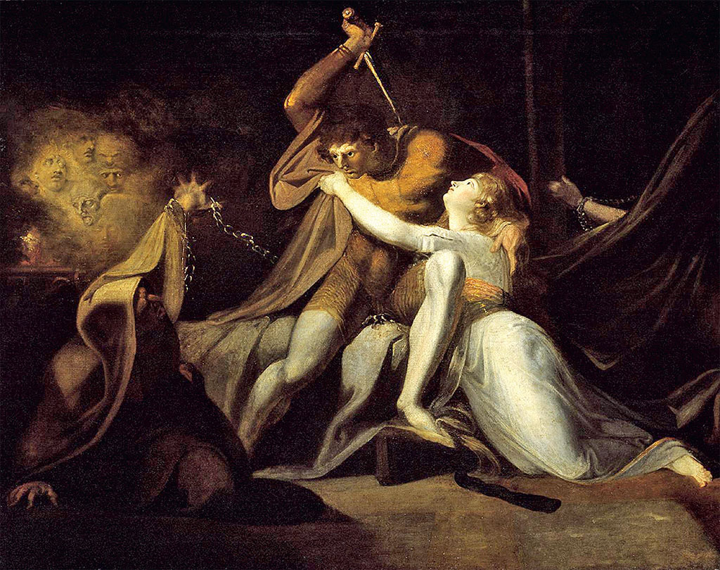 Театральность – одна из самых ярких особенностей живописи Фюссли. Он не пытается замаскировать ее историческими декорациями или правдоподобными деталями. Напротив, во многих его картинах фон намеренно затемнен, как, например, у Караваджо. Фюссли превращает пространство полотна в сцену, где разыгрывается действо. Этим же художник оправдывает избыточную экспрессивность жестов – перед нами не символические, а, в первую очередь, чувственные жесты. Фюссли сказал однажды: «Наши идеи – это порождение наших чувств». В его случае это особенно верно.