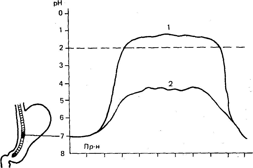 По данным Биргеле Э.Л. , у человека с нормальной гистоструктурой слизистой оболочки желудка в утренние часы исследования натощак выявляется стабильно высокая внутрижелудочная кислотность в теле желудка (1,5-2,0). Подобную высокую внутрижелудочную кислотность у здоровых людей натощак определили также ряд авторов, использующих как электрометрический метод (Juerre и соавт., 1981), так и радиотелеметрическую систему исследования желудка (Бабский Е.Б. с соавт., 1975). Высокая кислотность в желудке натощак обнаружена и у здоровых приматов (Старцев В.Г., 1972). Что касается динамики изменения кислотности после раздражения рецепторов желудка, то она практически остается на прежнем уровне в течение всего процесса исследования.