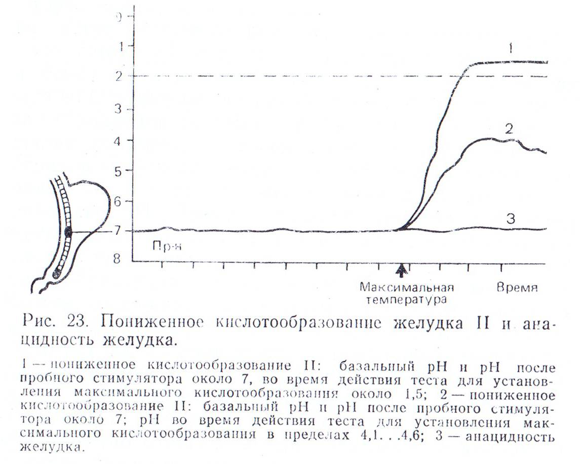 Если в период действия стимулятора рН не уменьшается или не достигает цифры 5, то считается, что это анацидность желудка. На рисунке 23 показаны пониженное кислотообразование желудка II и анацидность желудка.
