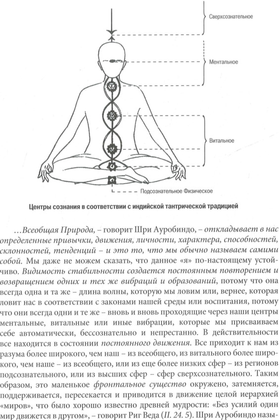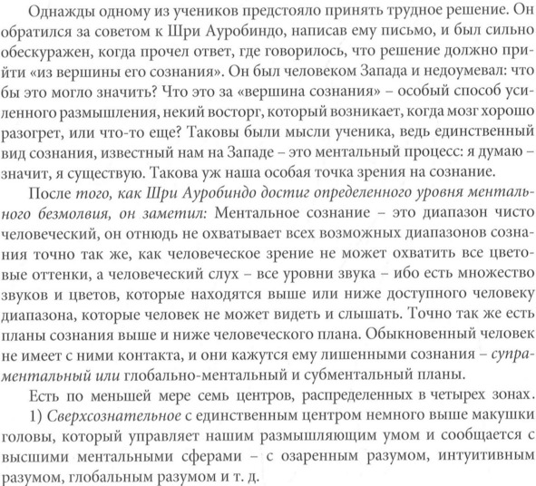 Шри Ауробиндо писал: «Ментальное сознание – это диапазон чисто человеческий, он отнюдь не охватывает всех возможных диапазонов сознания точно так же, как человеческое зрение не может охватить все цветовые оттенки, а человеческий слух – все уровни звука – ибо есть множество звуков и цветов которые находятся выше или ниже доступного человеку диапазона, которые человек не может видеть и слышать Точно так же есть планы сознания выше и ниже человеческого плана. То, что мы называем несознанием, – это просто иное сознание. … На самом деле, когда мы спим или когда нас оглушили, или когда мы находимся под влиянием наркотиков, или когда мы «мертвы», или находимся в любом другом состоянии – в это время мы не более бессознательны, чем при глубокой внутренней сосредоточенности на какой-то мысли, когда мы не замечаем ни нашего физического «я», ни того, что нас окружает. Для любого, кто хотя немного продвинулся в Йоге, это самое элементарное утверждение. И далее: По мере того, как мы продвигаемся вперед и пробуждаемся к осознанию души в себе и в предметах, нам становится ясно, что сознание присутствует и в растении, и в металле, и в атоме, и в электричестве – в любом предмете физической природы; мы обнаружим даже, что в действительности оно ни в каком отношении не является низшей или более ограниченной формой по сравнению с ментальной; наоборот, во многих «неживых» формах оно является более интенсивным, быстрым, живым, хотя и менее развитым в направлении к поверхности. Поэтому задача начинающего практиковать Йогу – это становиться сознательным во всех отношениях, на всех уровнях своего существа и на всех планах всеобщего существования – не только ментально; осознавать себя и других, и все предметы, находясь как в состоянии бодрствования, так и во сне; и, в конце концов, научиться быть сознательным в том, что люди называют «смертью», ибо и в смерти нашей мы будем обладать той же степенью сознательности, которую мы обрели в нашей жизни.
