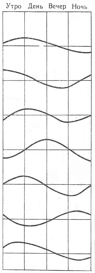 Исключением из правила времени максимума является также ваготоник. Он имеет, в определенной степени, измененные жизненные ритмы. Утром ему требуется очень много времени, чтобы прийти в себя. Только после 10 час его можно считать «нормальным» человеком. Время максимума ваготоника сдвигается на 1.2 часа позднее.