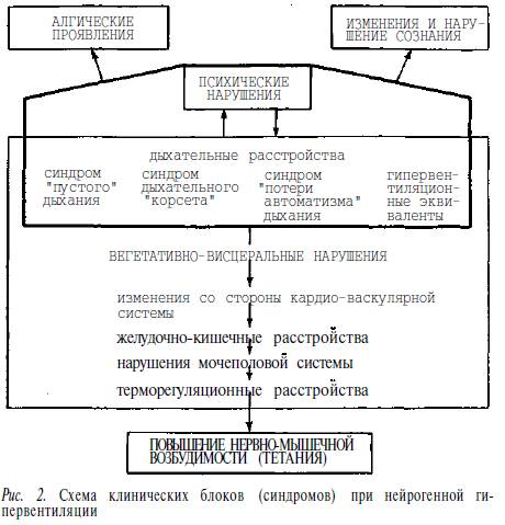 По мнению авторов, описание «ненейрогенных» факторов важно для того, чтобы в клиническом анализе больных с нейрогенной гипервентиляцией всегда учитывались и другие факторы, которые могут включиться в механизмы возникновения и развития гипервентиляционного синдрома (рис. 101).
