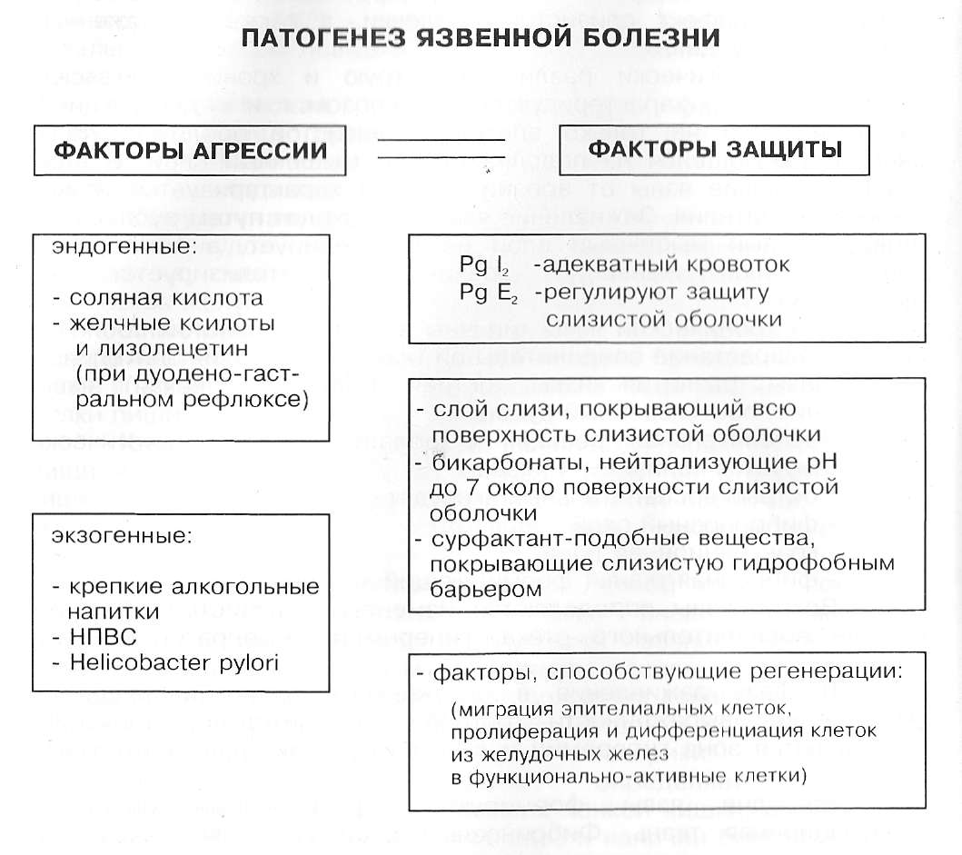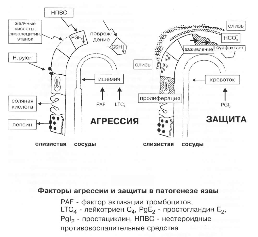 Согласно классическим представлениям, язва образуется в результате нарушения равновесия между агрессивными и защитными механизмами слизистой оболочки желудка и двенадцатиперстной кишки (Ивашкин В.Т., 2003; Леонова М.В., Белоусов Ю.Б., 1986; Богер М.М., 1986; Василенко В.Х., Гребенев А.Л., Шептупин А.А., 1987 и др.).