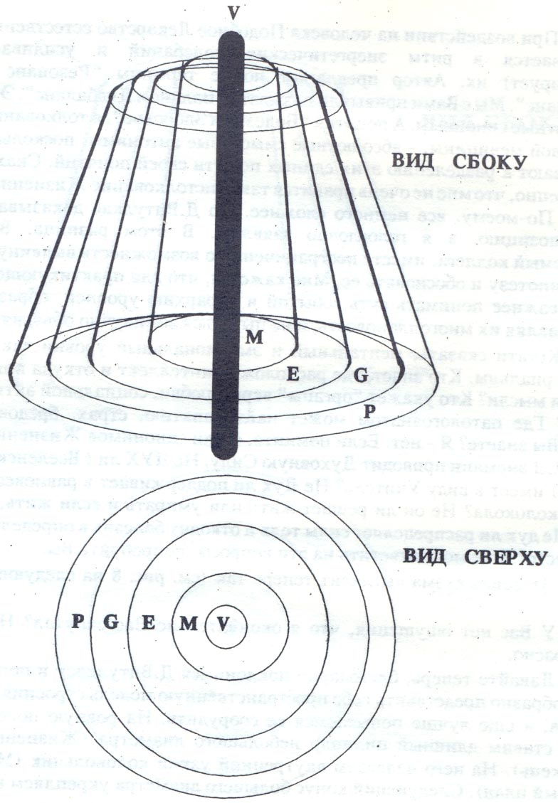 Недаром верхняя часть этого конуса открыта и расположена выше всех других на рисунке, ведь это решающий уровень. От него зависит ясность сознания, рациональность и логическая последовательность мыслей и поступков, отношение к профессии, к родным и друзьям, адекватное восприятие себя самого
