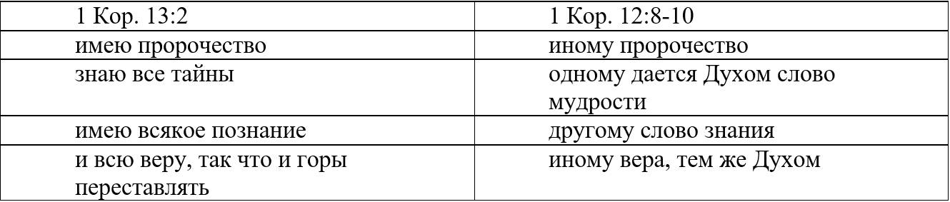 Достаточно очевидно, что в этом стихе перечисляются духовные дары. Все они уже упоминались в предыдущей главе этого послания, где Павел разъяснял: «Одному дается Духом слово мудрости, другому слово знания, тем же Духом; иному вера, тем же Духом; иному дары исцелений, тем же Духом; иному чудотворения, иному пророчество…» (1 Кор. 12:8-10). Пророчество и чудотворная вера в этих двух текстах называются одинаковыми терминами, а фразы «знаю все тайны» и «имею всякое познание» можно соотнести с дарами «слово мудрости» и «слово знания»: