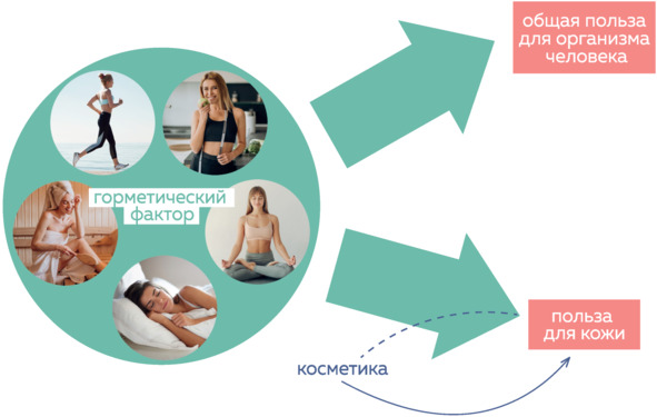 А еще, что интересно, универсальность гормезиса заключается и в том, что он применим к любому органу в организме человека. В том числе и к самому большому органу – коже. А молодость и здоровый вид кожи – это удел косметологии. В общем, если кратко, косметический крем способен запускать процессы гормезиса в коже. Как будто наша кожа «потренировалась» в зале, поголодала лечебным образом, отдохнула в сауне, помедитировала и не забыла выспаться…