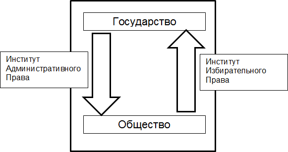 Следуя идеям Ф. Бекона[13] и Г. Кельзена[14] об отделении науки и права от ненауки и неправа, представим юридическую конструкцию, в которой сочеталось бы истинное, чистое, действительное положение избирательного права и законодательства, а не закрепленное Конституцией или иной формализованной нормой. Очевидно, что для существования права в государстве нет необходимости – достаточным является наличие договора и суда. Данное утверждение справедливо так же, как и то, что государство не может существовать без права, поскольку является его порождением. Следовательно, государство – это иллюзия (юридическая фикция) по форме и правила социальной игры по содержанию[15]. Отсюда следует, что конституционное право (независимо от наличия писаной Конституции) – это первородное право, описывающее форму государства (его государственных органов) и правила социальных игр, устанавливаемых в нём. Учитывая, что в данной социальной игре существует всего два субъекта права (государство, получившее правосубъектность, и народ как толпа, периодически обретающая правосубъектность), то возможных степеней свободы может быть только две – это свобода государства управлять народом, образующая административное право и являющаяся его источником, и свобода народа управлять государством, образующая избирательное право и являющаяся его источником. Описанную нами юридическую конструкцию можно охарактеризовать как отрасль Конституционного права, включающую в себя два столпа: институт Административного и Избирательного права. Наличие обоих институтов атрибутировано и обеспечивает устойчивость всей конструкции. Графически это может быть изображено следующим образом (см. Рис. 1).