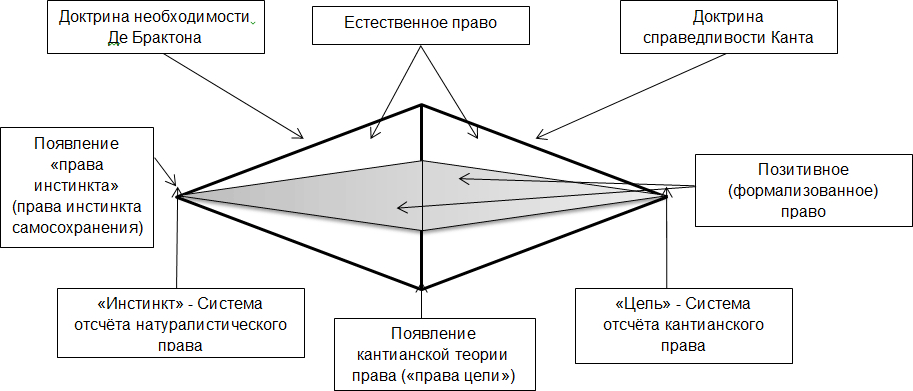 Дуализм естественного права: доктрина необходимости и доктрина справедливостиЧем проще юридическая конструкция, тем она совершеннее – считал Р. фон Иеринг[18]. Он же полагал, что любая юридическая конструкция основывается на натурально-историческом воззрении. Согласно ёмкому определению Н. Бондаря[19], в российской юридической традиции объективно воплощаются идеи права как высшей справедливости, основанной на недопустимости произвола и гарантированной равной для всех граждан мере свободы. Российское право, являясь наследием неокантианства, отражает идеи Штаммера, Иеринга и др., считая своим источником «цели» – идеалы справедливости. Между тем, теоретики конституционализма, рассуждая о целях как априорных идеях разума, то есть априорных идеях права в контексте неокантианства, и тактично умалчивая о неонатурализме, делают выводы о природе естественного права как о праве с меняющимся содержанием, «живом праве» и «живой Конституции». Они не принимают во внимание дуалистическую природу естественного права – внутреннюю (цель), определённую И. Кантом формулой «Право как цель», и внешнюю (необходимость), определённую Г. Брактоном формулой «Право как инстинкт». Из указанной дуалистической природы естественного права берут начало «докантовская», натуралистическая доктрина необходимости (Nessesity Doctrine) и моральная, называемая ещё кантианской, доктрина справедливости (A Theory of Justice)[20]. Обе доктрины сосуществуют в сегодняшнем юридическом мире неразрывно, оказывая существенное влияние на позитивное право, точнее являя в нем своё формализованное выражение. Для добросовестного правоприменителя и правотворческих органов принципиальными являются пределы сопряжения указанных доктрин, которые проходят по линии благосостояния (благополучия, безопасности) общества. Наличие достаточного количества ресурсов, вовлекаемых в юридический оборот, является триггером использования доктрины справедливости, и наоборот – недостаточность ресурсов обуславливает выбор правоприменителя в пользу доктрины необходимости, что отчетливо прослеживается в отечественном и зарубежном позитивном праве независимо от отрасли (см. пункт 3 статьи 55 Конституции РФ[21], пункт 1 статьи 39 Уголовного кодекса РФ[22], статью 2.7 Кодекса об административных правонарушениях РФ[23] и др.). Доктрина необходимости, несмотря на свою семисотлетнюю историю, продолжает применяться судами в виде прямой апелляции к ней[24] и, на наш взгляд, по мере увеличения населения и/или уменьшения количества ресурсов, вовлекаемых в юридический оборот, будет использоваться всё чаще. Очевидно, что полный переход законодательной и правоприменительной практики к доктрине справедливости и отказ от натуралистического подхода невозможен на данном этапе развития общественных отношений, так как он предполагает постоянное количественное увеличение вовлекаемых в юридический оборот ресурсов, причем не только материальных. Учитывая, что власть по своей природе есть ресурс прав и обязанностей, следование неокантианской доктрине требует регулярного увеличения объема власти (инфляции власти) и количества допущенных к ней лиц. Иными словами, количество выборных государственных и муниципальных должностей должно коррелировать с уровнем благосостояния (благополучия, безопасности) общества. Такая 