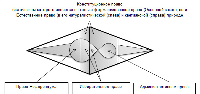 Предложенная выше схема наглядно иллюстрирует фактическое положение отрасли конституционного права и его институтов – избирательного и административного права – и с очевидностью показывает, что область административного права почти всецело находится в пределах конституционного права, причем той его части, которая имеет кантианскую природу «Право как цель», то есть выполняет отведенную ему роль института по управлению обществом, исходя из правовых целей, чего нельзя сказать о праве избирательном. Последнее оказывается разделённым на три части: две из них находятся в области конституционного права (дуализм) и одна выходит за его пределы. Краеугольным камнем настоящего исследования являются протяженность избирательного права, установление его границ, и объективная юридическая логика приводит нас к мысли о том, что как предмет права не может быть больше объекта права, так и институт права не может быть больше его отрасли и, тем более, не может влиять на неё. Но раз право референдума может влиять на конституционное право, изменять его и даже отменять, то логично предположить, что, несмотря на схожесть процедур избирательного права и права референдума, они не только не образуют единый институт, но и имеют различную правовую природу. Право референдума, находясь за рамками конституционного права (хотя допускается его формализация), должно быть выделено из избирательного права, после чего его можно рассматривать как качественно иную правовую систему со всеми вытекающими последствиями.