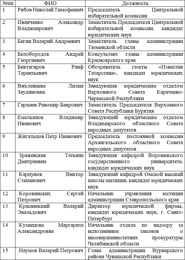 В качестве доказательства сказанного выше рассмотрим персональный состав первого формирования Центральной избирательной комиссии России: