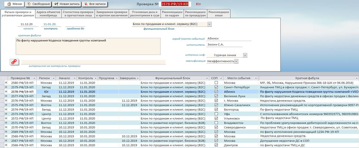 Создается База данных корпоративных расследований (БДКР), куда заносятся все проводимые и завершенные расследования, а также сведения, необходимые для контроля и анализа (период проведения, кто проводил, кто фигурант, где произошло, выводы и рекомендации, реализация корректирующих мер).