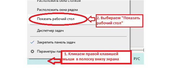 Примечание для начинающих: если Рабочий стол на компьютере не виден в текущий момент работы (например, из-за того, что экран полностью занят открытым приложением), то сначала откроем доступ к рабочему столу, «свернём» все открытые окна других приложений. Если не видим кнопки «Свернуть все окна» (её отображение зависит от настроек компьютера), то наведём курсор мыши на самую нижнюю часть экрана, полоску, которую называют «Панель Задач». Затем нажмём правую кнопку мыши, а в появившемся окне меню щёлкнем левой кнопкой мыши на «Показать Рабочий стол». Все прочие окна с открытыми приложениями свернутся и нам откроется Рабочий стол.