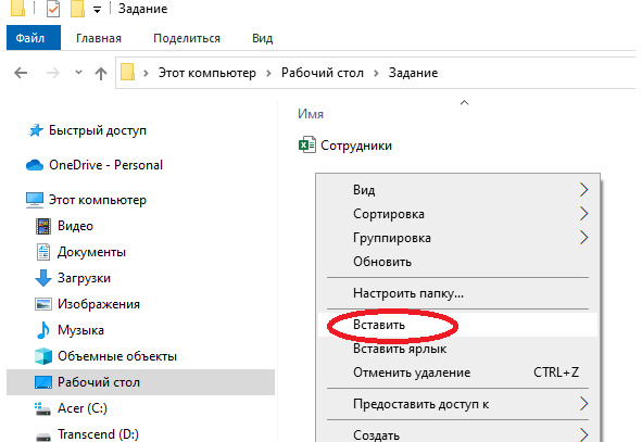 После чего откроем папку «Задание», кликнем правой кнопкой мыши на свободное место в папке и выберем «вставить».