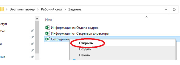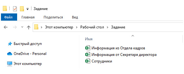 Аналогично скопируем с флэшки и второй файл. Все три файла (два файла с исходной информацией и созданный нами новый файл «Сотрудники») теперь лежат в одной папке «Задание».