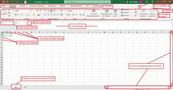 10 – Ярлычки с именами листов расположены внизу окна. Листы можно переименовывать для удобства поиска информации, добавлять и удалять. В одном файле Excel можно создать сотни листов, но обычно этого не делают, потому что при очень большом количестве листов становится неудобно искать нужную информацию.
