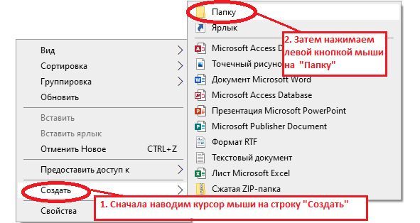 Наводим курсор мыши на любое свободное место Рабочего стола и жмём правую кнопку мыши. В открывшемся окне меню наводим курсор мыши на «Создать», а в следующем появившемся окне меню наводим курсор мыши на «Папку» и жмём левую кнопку мыши.