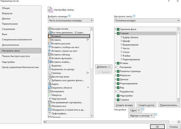 После этого попадем в окно настроек параметров Excel, где можем управлять отображением вкладок и команд в этих вкладках или создать свою вкладку со своим набором команд.