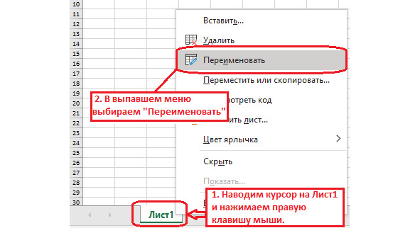 Для того, чтобы переименовать «Лист1» в новое название «Информация от Секретаря» в файле «Сотрудники», наводим Курсор мыши на «Лист 1», нажимаем правую кнопку мыши. В появившемся меню выбираем «Переименовать».