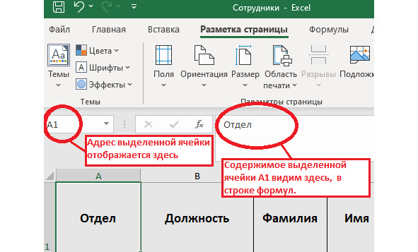Выделяем нужную ячейку, которую собираемся скопировать. Выделить нужную ячейку – это значит встать на неё курсором с помощью стрелок клавиатуры, или указав на ячейку курсором мыши и кликнув левой кнопкой мыши. Например, выделим ячейку А1. Она находится на пересечении столбца А и первой строки, в самом верхнем левом углу. Адрес выделенной ячейки (А1) – отображается в поле имени объекта, а её содержимое – (Отдел) отображается в строке формул, как видим на рисунке.
