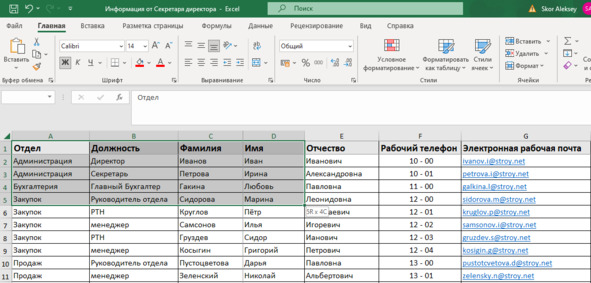 Откроем первый из исходных файлов «Информация от секретаря директора». Как видим, тут не вся информация по заданию (нет даты рождения, даты приёма на работу, стажа и возраста), но при этом есть информация, которой по заданию не требовалось (рабочий телефон и почта)