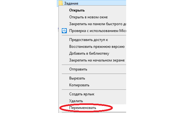 Переименование папки «Задание»: выбираем «Переименовать»…