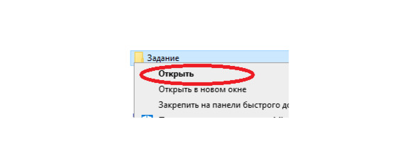 Для этого наведём курсор мыши на папку «Задание» и нажмём правую кнопку мыши. В появившемся окне меню наводим курсор на «Открыть» и жмём на левую кнопку мыши.
