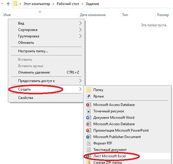 Наводим курсор мыши на любое свободное место в открытой папке «Задание» и нажимаем правую кнопку мыши. В окне меню выбираем «Создать», а в следующем открывшемся окне меню выбираем «Лист Microsoft Excel»