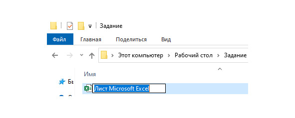 В ранее пустой папке «Задание» теперь появился новый файл с выделенным именем «Лист Microsoft Excel». Когда имя файла выделено так, оно готово к переименованию – то есть мы можем набрать любое новое имя файла с клавиатуры и оно заместит собой имя «Лист Microsoft Excel».