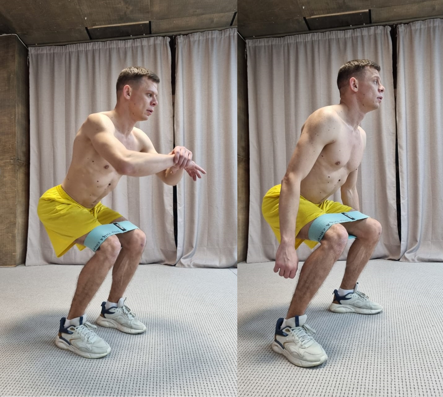 Если тренажера нет в наличие, используйте фитнес резинку в положении полу-приседа.