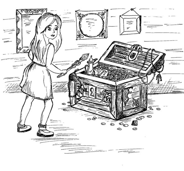 «Что же делать, что же делать? Ведь если Аня не очнётся, то эти ветки схватят её! А что будет дальше?..» Что будет дальше, Лиза даже боялась представить. «Надо разбить стекло!» – пришла идея девочке. Она стала озираться в поисках чего-нибудь тяжёлого, но пол был идеально пуст. Только перед дубом стоял большой и красивый сундук. Девочка подбежала к нему и с большим трудом подняла крышку. Сундук был полон. Он был заполнен какими-то монетами, украшениями, одеждой. Всё лежало вперемешку. Лиза оглянулась – ветки-щупальца уже были недалеко от Ани. Надо действовать. Надо придумать, как помочь сестре. Лиза схватила увесистую золотую палку с какими-то камнями и рванула к зеркалу. Не успела затормозить и больно ударилась о холодное зеркало. А ветки-щупальца всё ближе и ближе…