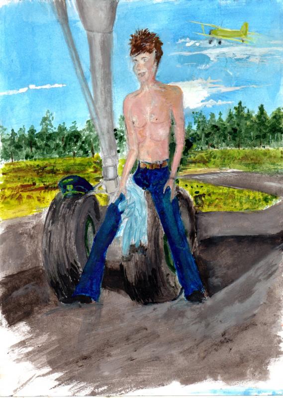 В Коровино-Быково ветер дует поперек полосы больше, чем нам можно, т.е. больше 12 метров и мы сидим, ждем, когда же он ослабнет или хотя бы на встречный подвернет, чтобы мы вылететь смогли. Лично я сидел в черных носках, но, сняв рубашку, под правым крылом (правильно: под правой консолью крыла) на колесе основной стойки шасси и загорал. Я просто никому не мог мешать, потому что, никого вокруг не было, даже редкие в Котласе самолеты разлетелись…