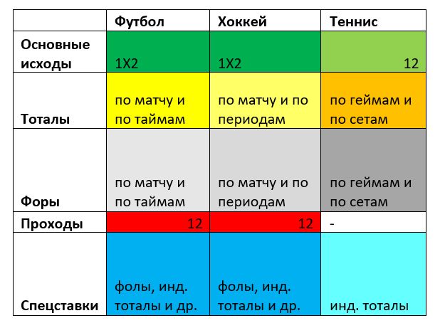 Сегменты рынков – анализируемые части линии, в зависимости от вида спорта и предполагаемых исходов, на которых действуют схожие правила и ситуации, согласно матрицы ниже.