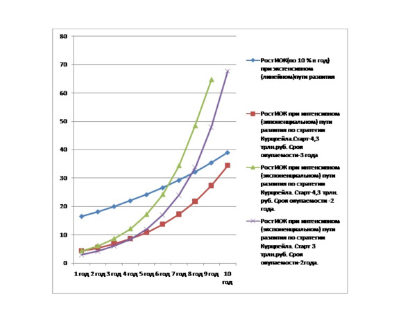 Т.е. для перевода экономики на инновационные рельсы нужен рост инновационного комплекса РФ по экспоненциальной зависимости (геометрической прогрессии) и концентрация ресурсов на главном направлении.