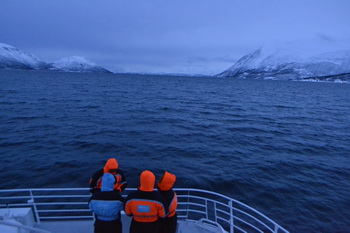 Оставив встречу с сиянием на волю случая, на следующее после прилета утро мы с супругой отплыли на громадном катамаране вдоль фьорда, чтобы поучаствовать в китовом сафари. Одетые во все теплое и ветронепроницаемое люди, отправившиеся вместе с нами на встречу с китами, чувствовали себя участниками какой-то загадочной арктической экспедиции и гордо позировали перед фотокамерами на палубе на фоне видневшихся вдали льдин. Наш корабль с не менее героическим названием «Исследователь Севера» долго шел по фьорду, а затем вышел в открытый Северный Ледовитый океан. В это время туристы ходили с выражениями лиц «морских волков» и вглядывались в бескрайние суровые водные дали.
