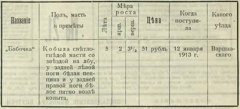 Показанную в прилагаемой описи лошадь под названием «Бабочка», приобретенную для Заречного Отделения Варшавской Пригородной Земской стражи взамен негодной к службе лошади (приказ от 30 марта 1912 года за №39) предписываю зачислить на фуражное довольствие со дня ее приобретения, то есть с 12 января сего года.