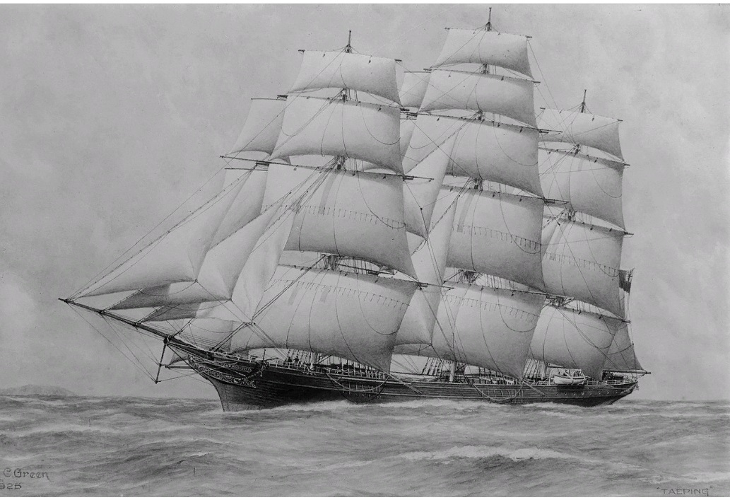 Заказанный Джорджем Томпсоном клипер спустили на воду в 1868 г. Всех, кому довелось лично увидеть «Фермопилы», корабль поражал, в первую очередь, необычной окраской: тёмно-зелёные борта при золотом бархоуте13 и белом рангоуте. Нос украшала скульптура предводителя греков в Фермопильском сражении – геройски погибшего спартанского царя Леонида. Уже для первого плавания подобрали экипаж первоклассных «гонщиков» в количестве 34 моряков.