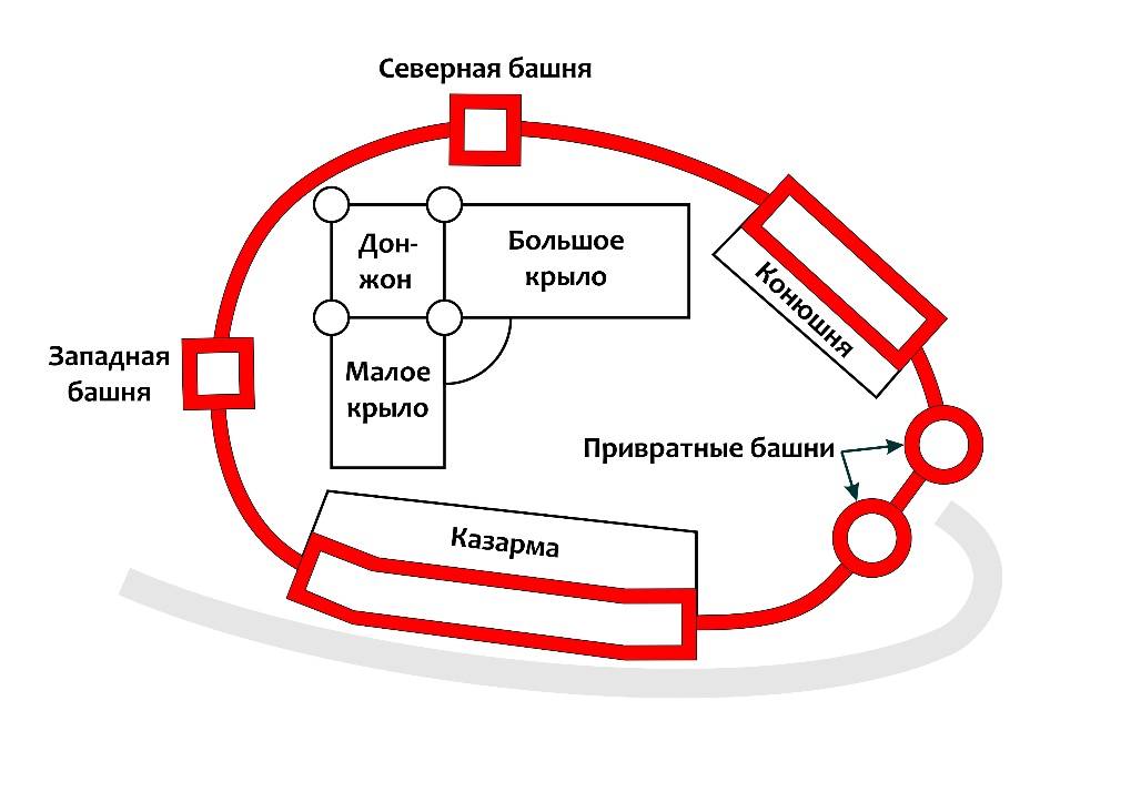 Казарма, встроенная в крепостную стену, имела три этажа. На самом верхнем стояли катапульты для метания каменных ядер, а также чаны для смолы, дабы, расплавленную, лить ее на двигающегося по дороге к воротам противнику. Караульное помещение находилось на втором этаже.